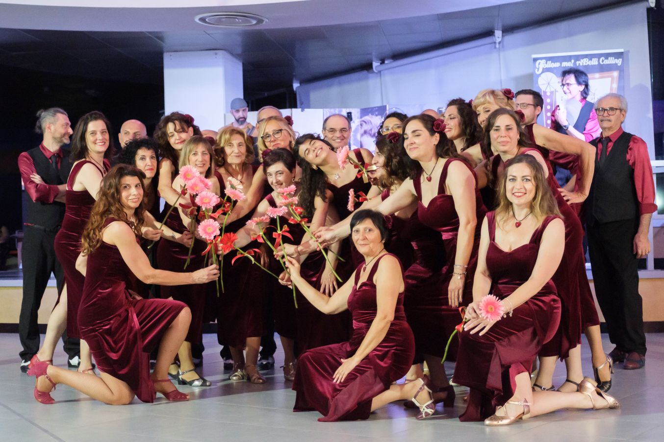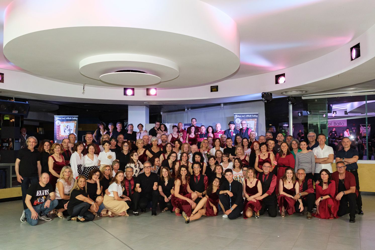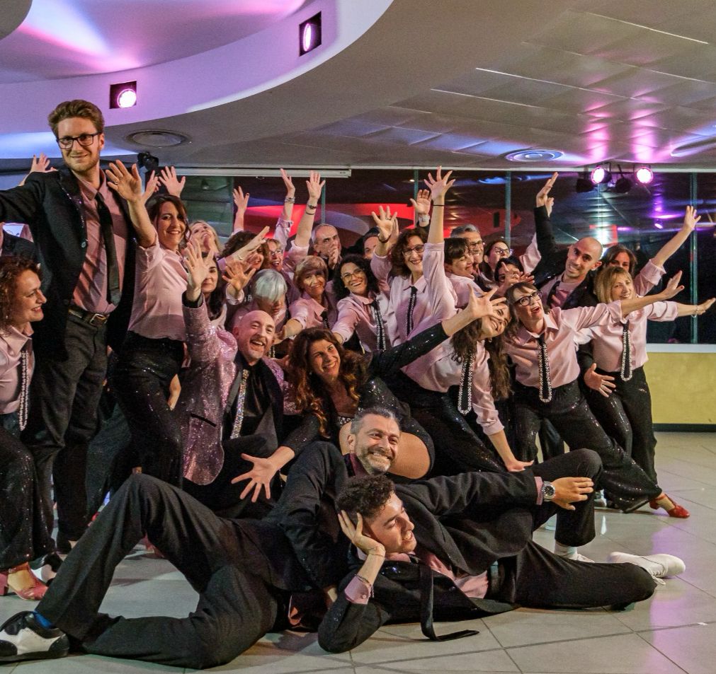 Una grande famiglia di ballerini appassionati che condividono la gioia del ballo swing